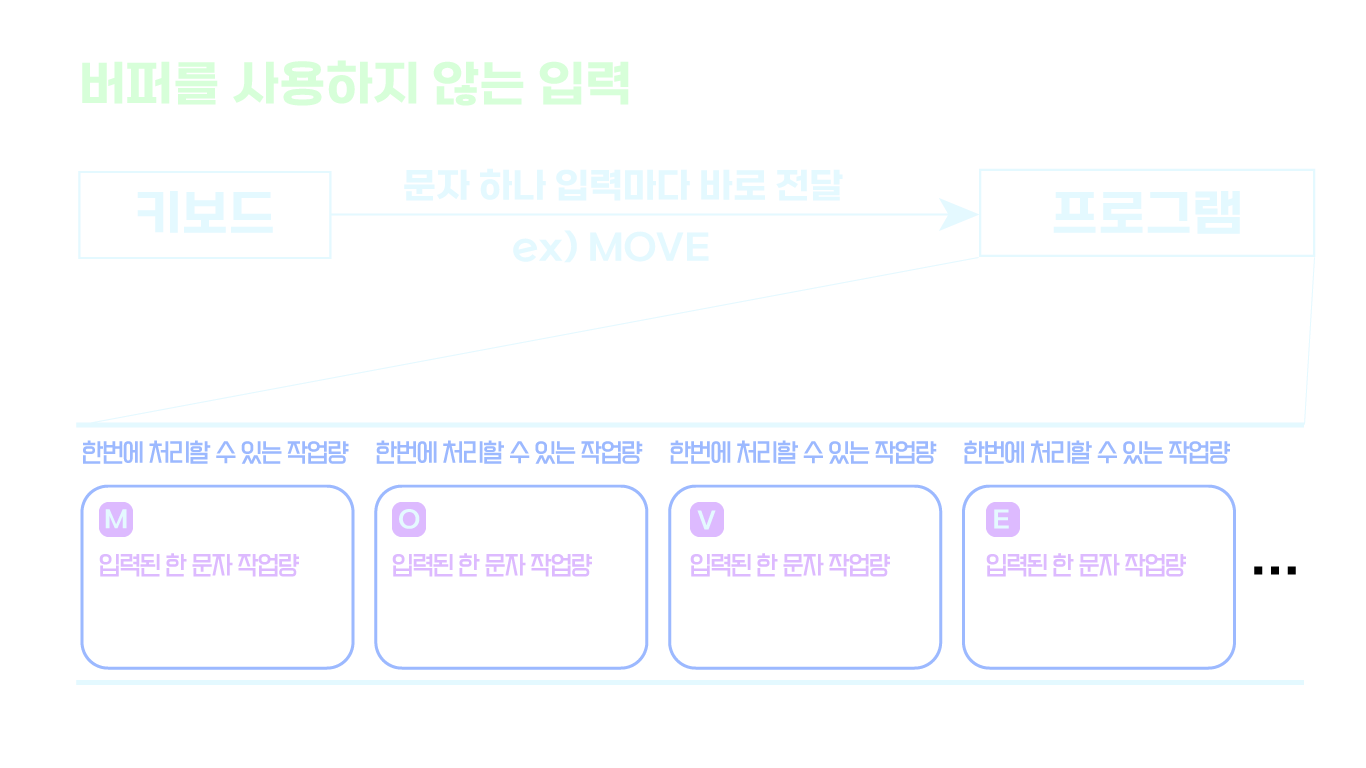 예를 들어 사용자가 프로그램 사용 중 키보드를 통해 MOVE라는 단어를 쳤다고 가정해보자. 버퍼가 없는 경우에는 키보드에서 M, O, V, E를 각각 칠때마다 프로그램으로 해당 입력이 전달된다. 이 때 프로그램 내에서 작업과정을 들여다보자. 저 진한 파란 네모칸이 프로그램의 하나의 작업이고 네모의 크기가 한번에 처리할 수 있는 작업량이라고 가정한다. 버퍼를 이용하지 않는 경우에는 사용자가 키보드를 한번씩 클릭할때마다 각각의 문자가 프로그램으로 바로 전달이 되므로 문자마다 각각 하나의 작업으로 잡히게 된다. 이때 일반적으로 프로그램이 한번의 처리할 수 있는 작업량보다 입력된 하나의 문자를 처리하는 작업량의 크기는 매우 작다. 그러므로 매 작업마다 파란색 네모에서 보라색 네모만큼을 제외한 나머지 만큼의 작업량이 기회비용이 되어 날아가버린다. 결국 속도면이나 효율성 측면에서 떨어진다는 것을 알 수 있다.