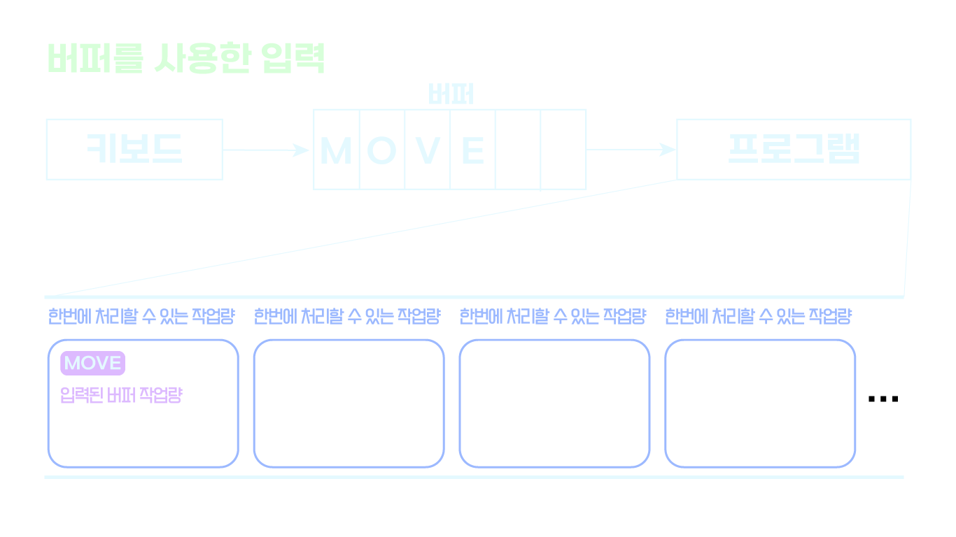 앞선 예시와 똑같이 사용자가 프로그램 사용 중 키보드를 통해 MOVE라는 단어를 쳤다고 가정해보자. 버퍼가 있는 경우에는 특정 문자나 행동이 들어올때까지(예를 들면 엔터나 스페이스 또는 버튼 클릭 등의 이벤트 등) 버퍼에 사용자가 입력한 문자 M,O,V, E를 차례대로 저장한다. 그러다 엔터나 스페이스와 같은 버퍼의 끝을 알리는 동작이 입력이 되면 지금까지 버퍼에 저장해두었던 문자를 프로그램으로 보낸다. 이때 앞선 예시와 같이 저 진한 파란 네모칸이 프로그램의 하나의 작업이고 네모의 크기가 한번에 처리할 수 있는 작업량이라고 가정한다면, 프로그램에서는 버퍼를 통해 들어온 "MOVE"라는 문자 처리를 하나의 작업으로 잡게된다. "MOVE"라는 단어도 일반적으로 프로그램이 한번에 처리할 수 있는 작업량에 비하면 매우 작지만, 대신 사용자가 입력한 문자 전체를 한번에 처리하므로 날라가는 기회비용이 적다. 결국 속도면에서나 효율적인 측면에서 버퍼를 사용하는 것이 좋다는 것을 알 수 있다.